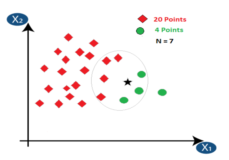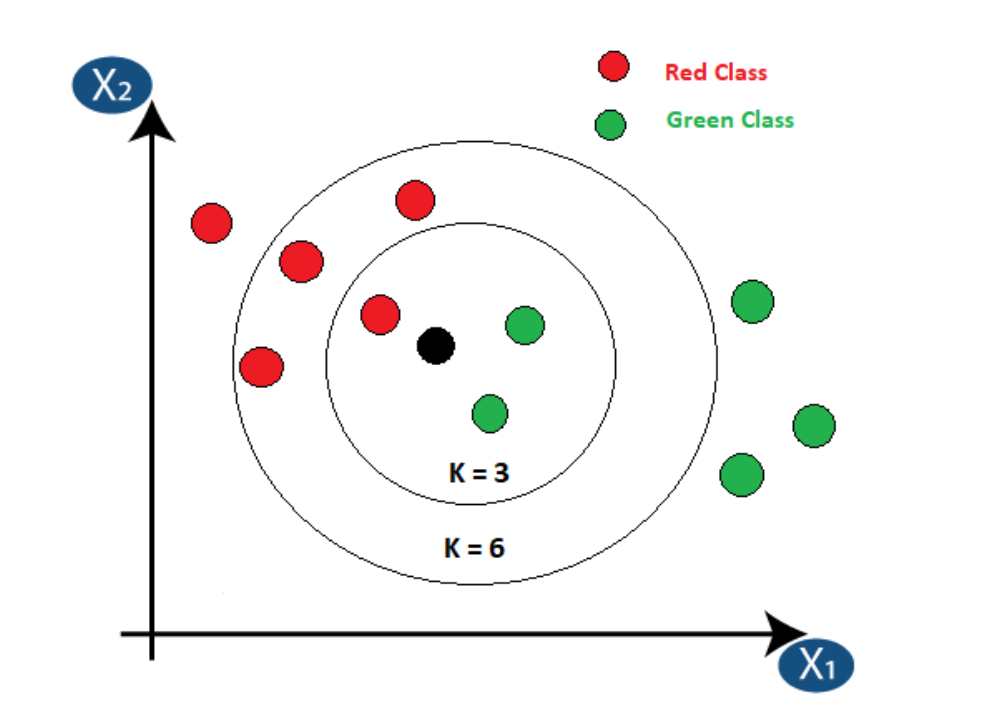 Suppose K value is 5 then new point having 3 red point neigbhors and 2 green