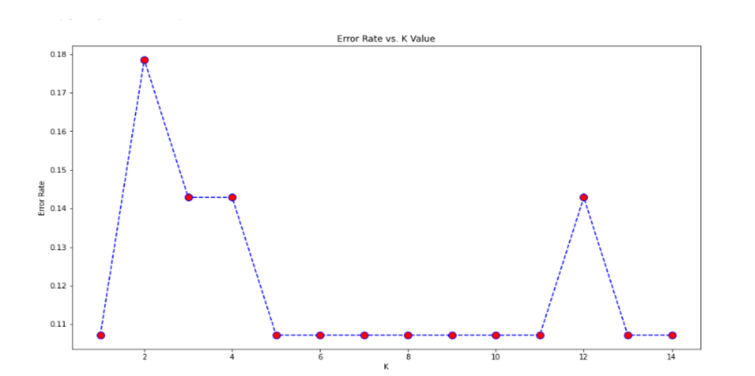 of the K is between 5 and 11. I would advise you to calculate accuracy by using K
