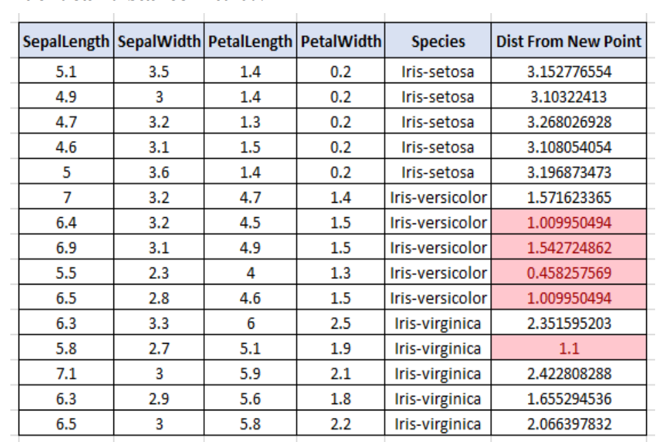 table out of 5 nearest neighbors 4 belongs to species Iris-versicolor, 1 belong to