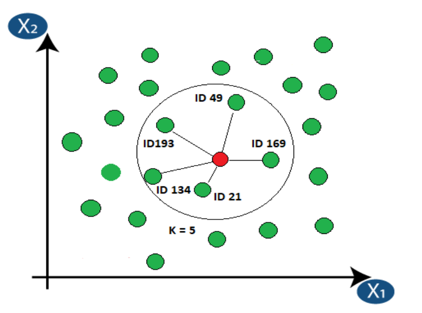 Suppose our K is 5 hence ID21, ID49, ID93, ID134, ID169 nearest neighbors of